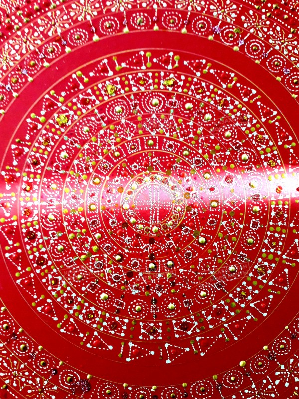 Художник Санжар Жубанов, известный тем, что возрождает древнее искусство петроглифов, представил свое абстрактное видение будущего. На конкурс он прислал графический рисунок Солнца, нарисованный точками гелевой ручкой на красной бумаге.