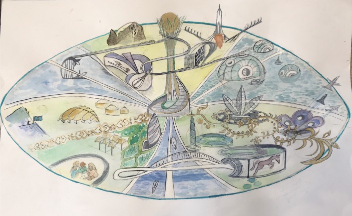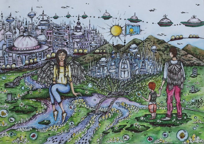 Студентка из Семея Полина Горяева видит будущий Казахстан технологически развитым и при этом сохранившим первозданную природу. Ее работа называется "На крыльях будущего". У каждого жителя страны - собственные крылья, с помощью которых они могут летать. А если посреди полета появилось желание отдохнуть - в их распоряжении парящие в воздухе зеленые островки, на которые можно опуститься для отдыха. С них открывается вид на огромный цветущий город будущего.
