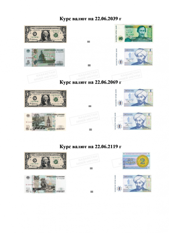 На рисунке изображены курсы валют 22 июня в 2039, 2069 и 2119 годах. По замыслу автора, в 2039 году доллар будет стоить 10 тенге. В 2069-м казахстанская валюта укрепится еще больше и курс составит 1 тенге за доллар. А в 2119-м доллар будет стоить два тиына.