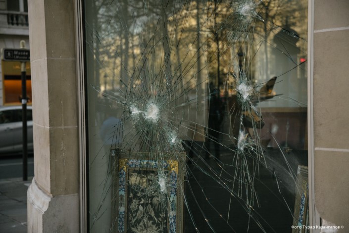 Следы от предыдущих погромов заметны на витринах бутиков.