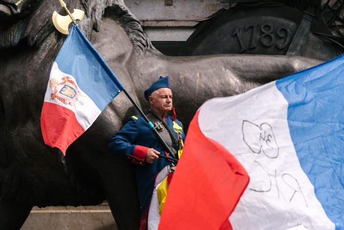 Несколько человек забрались на фигуру льва и в мегафон выкрикивали что-то на французском.