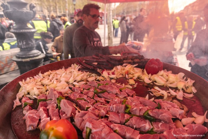 Пройдя в глубь толпы, мы заметили несколько торговых точек. Там готовили сосиски и шашлыки.