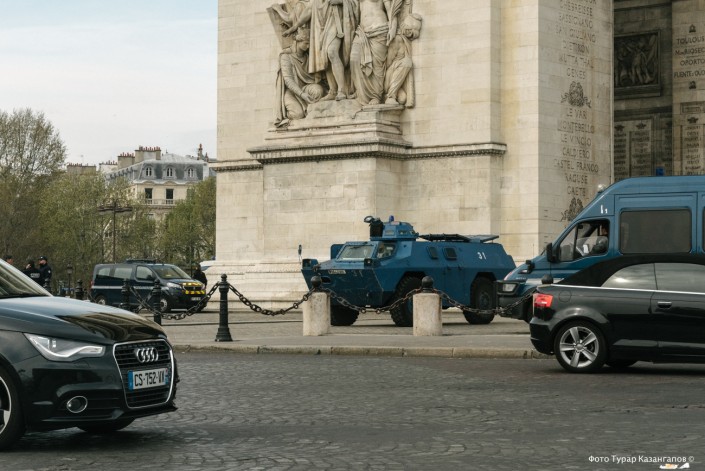В декабре прошлого года в этот популярный туристический объект вторглись протестующие и устроили там погромы. Теперь арка под надежной защитой. В марте произошли погромы и пожары на Елисейских полях.