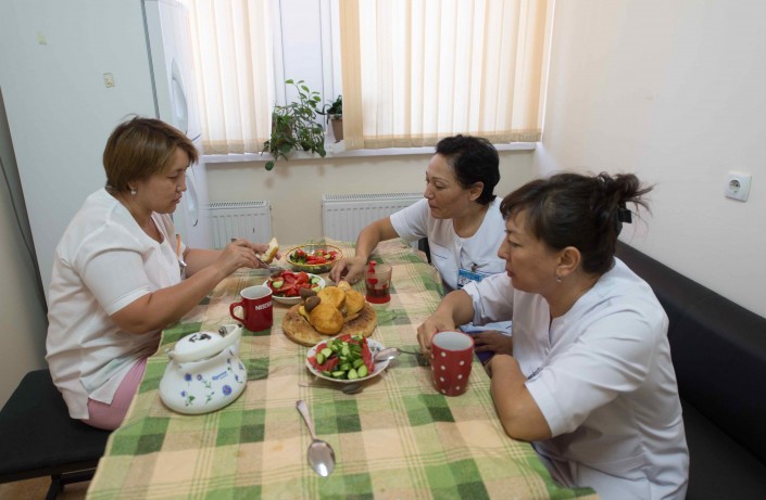 Сегодня выдался один из так называемых "жарких" дней. Потому и обедает бригада почти перед завершением смены – в 16:00. "У нас нет такого, как в других организациях, где строго определено время обеденного перерыва. Я же не могу сказать женщине, которая рожает – ой, подождите, я схожу пообедаю", - улыбается Актолкын Амирова.