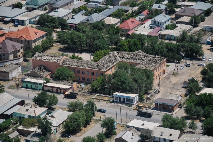 Так сейчас выглядит город Арысь, где 24 июня взорвались склады с боеприпасами. Борт министерства обороны совершил плановый облет окрестностей Арыси. Фотокорреспонденту Tengrinews.kz  Турару Казангапову удалось сделать несколько эксклюзивных кадров с высоты.