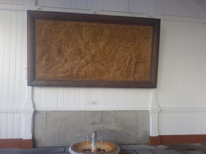 А это одна из легенд. На картине изображен эпизод охоты короля Карла IV, когда собака, пытаясь догнать оленя, прыгает в воду и взвывает. Потом лекари заметили, что вода имеет целебные свойства. И король на себе испробовал воду, которая улучшила состояние его больной ноги.