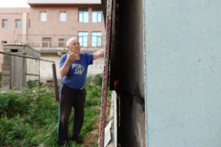 Павлов показывает нам трещины и разрушения, которые, как считает он, произошли в результате застройки вокруг его дома.