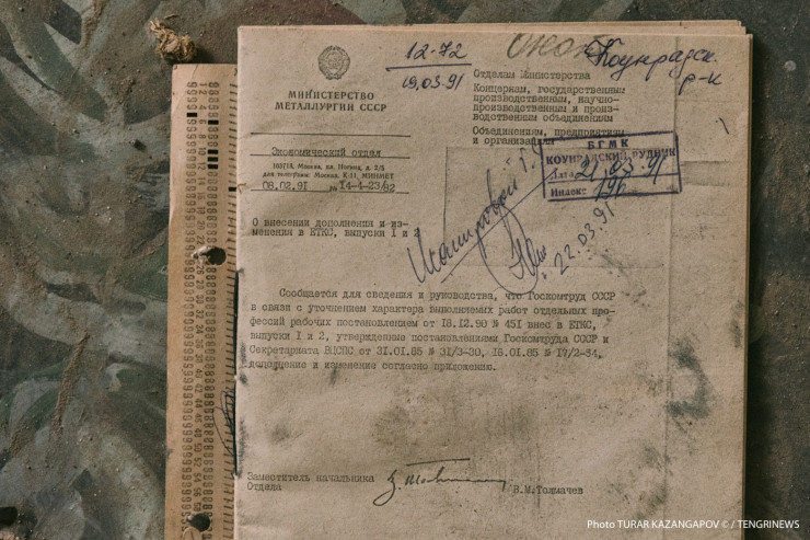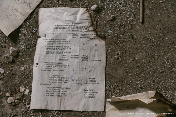 Среди найденных здесь документов есть и относящийся уже к периоду независимости. Это немного обгоревшая справка на премирование руководящих работников Коныратского рудника. Было это в 2001 году.
