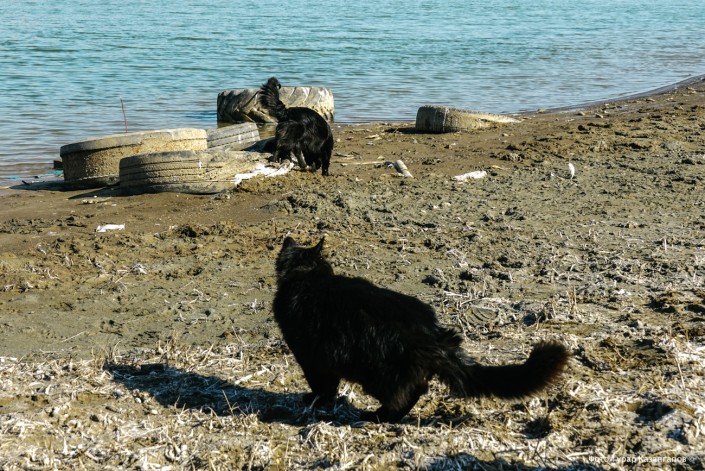 Крики чаек. На берег выбежала собака, схватила уже почти сухую рыбу, отнесла в сторонку и, придерживая добычу одной лапой, в два счета съела всю тушку. А потом тут же отправилась за добавкой. На побережье стоит специфический запах. Рядом с очередной мертвой рыбешкой валяется труп птицы.