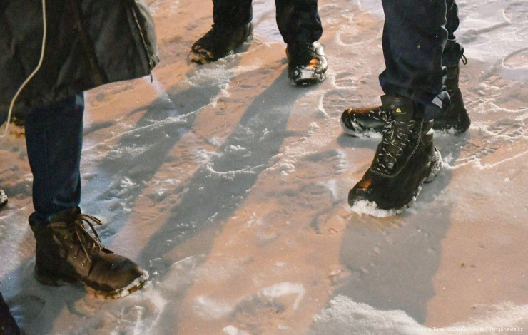 Снегопад усиливается. Журналисты замечают ботинки Алтая Кульгинова.
