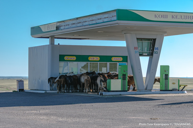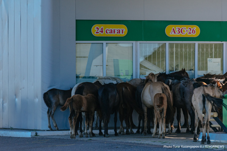 Наше внимание привлек табун лошадей, собравшийся на заправке. Как говорится, придумайте надпись к фото.