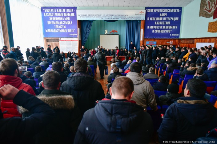Между тем в актовом зале становится больше людей. На встречу с шахтерами приехал председатель профсоюза "Коргау" Марат Миргоязов.