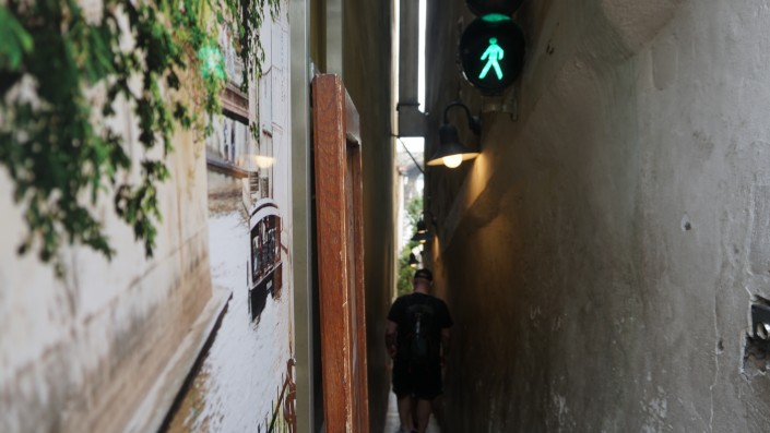 Если пройти дальше, можно выйти на улицу Винную, где расположена самая узкая улочка. На ней два человека не разойдутся, поэтому тут установлен светофор.