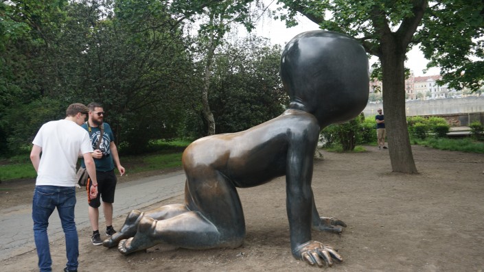 Отсюда же недалеко до музея Франца Кафки. Перед входом в музей установлена скандальная скульптура Давида Черны "Писающие мужчины". Скульптор прославился множеством подобных арт-объектов. Первая его работа - это танк, выкрашенный в розовый цвет, который он отправил на плоту по Влтаве. За эту шалость Давиду Черны выписали огромный штраф и арестовали на 14 суток. Он также создал памятник Подхалимству, вращающуюся голову Франца Кафки, автобус на руках в Лондоне, голову, плюющую в океан, в Нью-Йорке и многие другие.