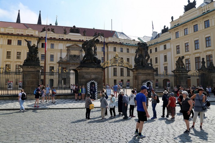 Мы, имея в запасе всего несколько часов, сразу же направились к Пражскому граду, самому большому дворцовому комплексу, занесенному в Книгу рекордов Гиннесса. В нем и сейчас расположена резиденция президента. Каждый час у входа можно увидеть торжественную смену караула. Почетный караул стоит в маленьких будках по две стороны от входа.