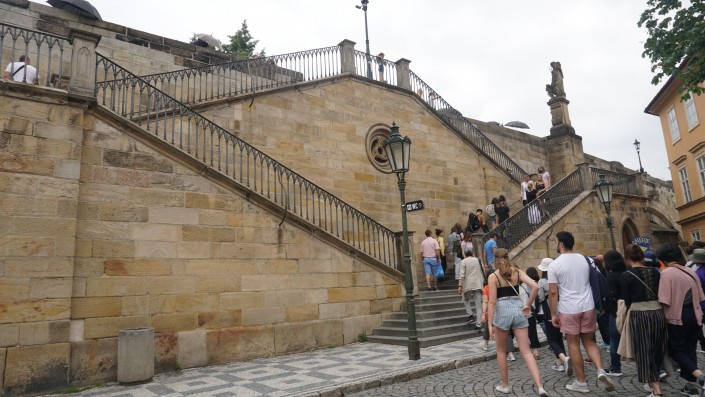 В этом же районе нас провожают к лестнице, на которой снимались сцены фильма "Миссия невыполнима -1" с Томом Крузом. По этой лестнице он съезжал на мотоцикле, а потом оказывался на набережной Влтавы.