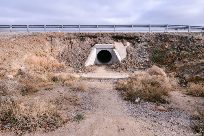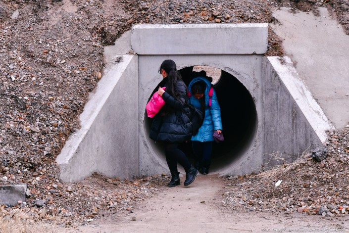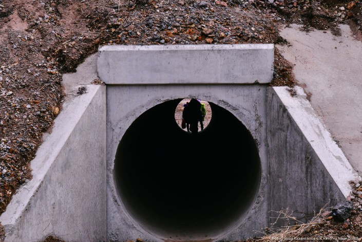 "Это труба для воды. Дети вот так, нагнувшись, проходят. Но нам не всегда разрешают здесь проходить. Вообще, мы не каждый день так ходим, обычно на автобусе ездим. Когда автобусов нет, идем пешком, через эту подземку. А те, кто живет еще дальше, идут по скотопроводу, оттуда легче пройти", - говорит местная жительница.