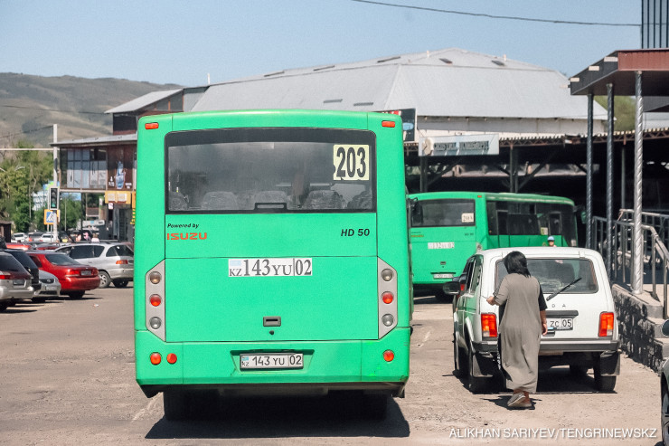 Неподалеку стоянка автобусов. Как нам объяснили сами жители, транспорт курсирует между Алматы и Талгаром.