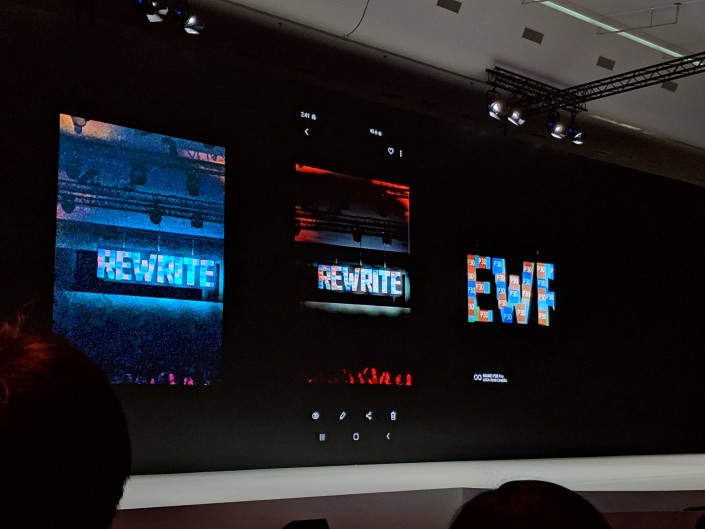 19:41 На сцену вышел специальный человек, стреляющий над головами всех присутствующих в зале из фоторужья Huawei в противоположную от сцены стену, где красуется надпись REWRITE.