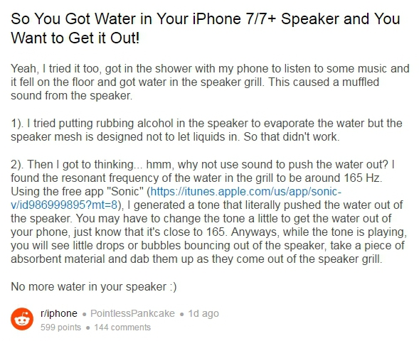 "И тут я подумал - почему бы не использовать звук, чтобы вытолкнуть воду? Я узнал, что резонансная частота составляет 165 Гц. Используя бесплатное приложение Sonic, я сгенерировал звук, который буквально вытолкнул воду из динамика. Можно немного изменить частоту, но она должна быть близка к 165 Гц. Как только вы увидите, как капли воды выпрыгивают из динамика, возьмите любой впитывающий материал и промокните их", - посоветовал пользователь.