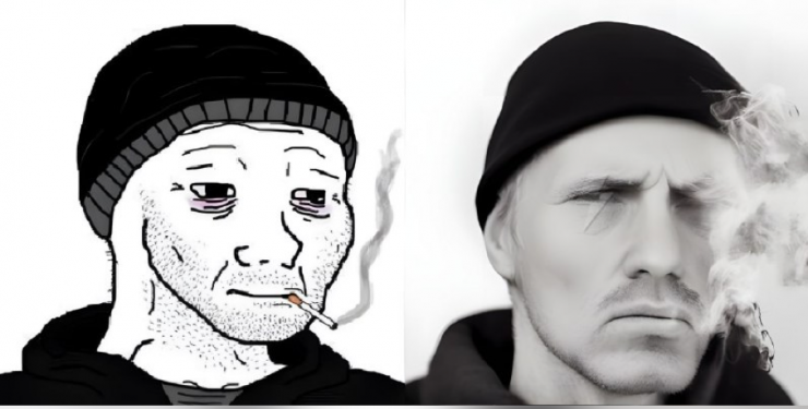 Один из самых популярных думеров с сигаретой был первым, кого попытались воссоздать. В версиях искусственного интеллекта думер с сигаретой превратился в грустного Райана Гослинга. Вспомнить только кадр из фильма "Драйв" и курящего Райана за рулем Chevrolet Chevelle Malibu 1973 года выпуска.