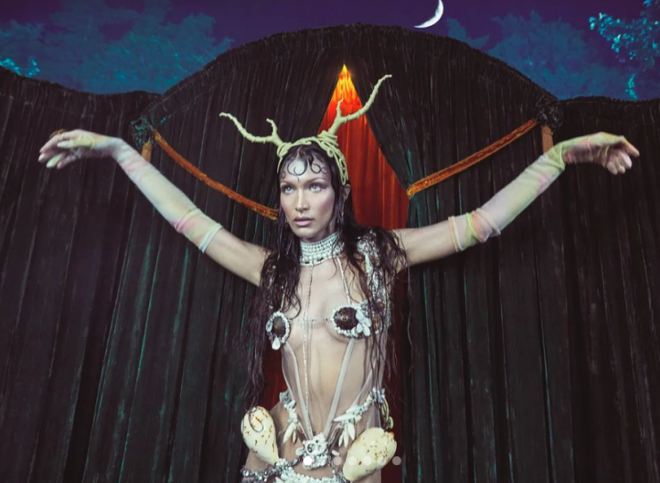 Образ Беллы получился настолько сложным и противоречивым, что буквально заставляет всматриваться в фотографию, чтобы разглядеть все детали. Начиная от необычного наряда с бусинами и ракушками, заканчивая прозрачными перчатками и рогами - образ Беллы полон противоречий и потому прекрасен.