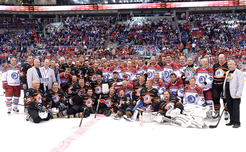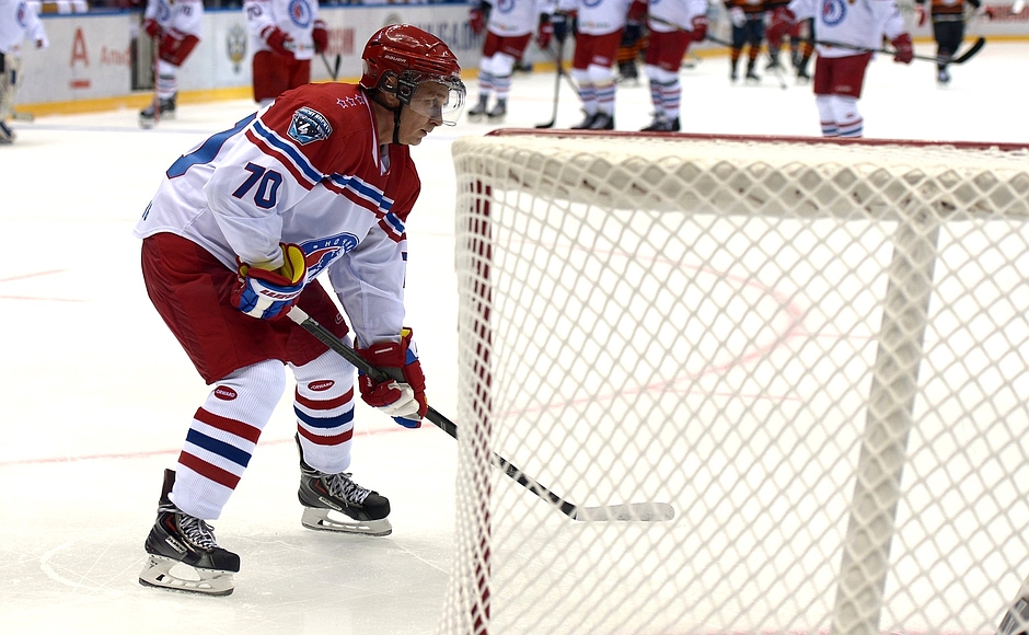 Президент России Владимир Путин забил восемь шайб в гала-матче Ночной хоккейной лиги (НХЛ), проходившем в субботу в Большом Ледовом дворце Сочи и посвященном 70-летнему юбилею со дня победы в Великой Отечественной войне. Игра между командами "Сборная НХЛ" и "Звезды НХЛ" завершилась со счетом 18:6 в пользу последней. Путин играл за команду "звезд", в составе которой были министр обороны Сергей Шойгу, вице-премьер Аркадий Дворкович и другие чиновники, политики и звезды хоккея, сообщает URA.Ru.