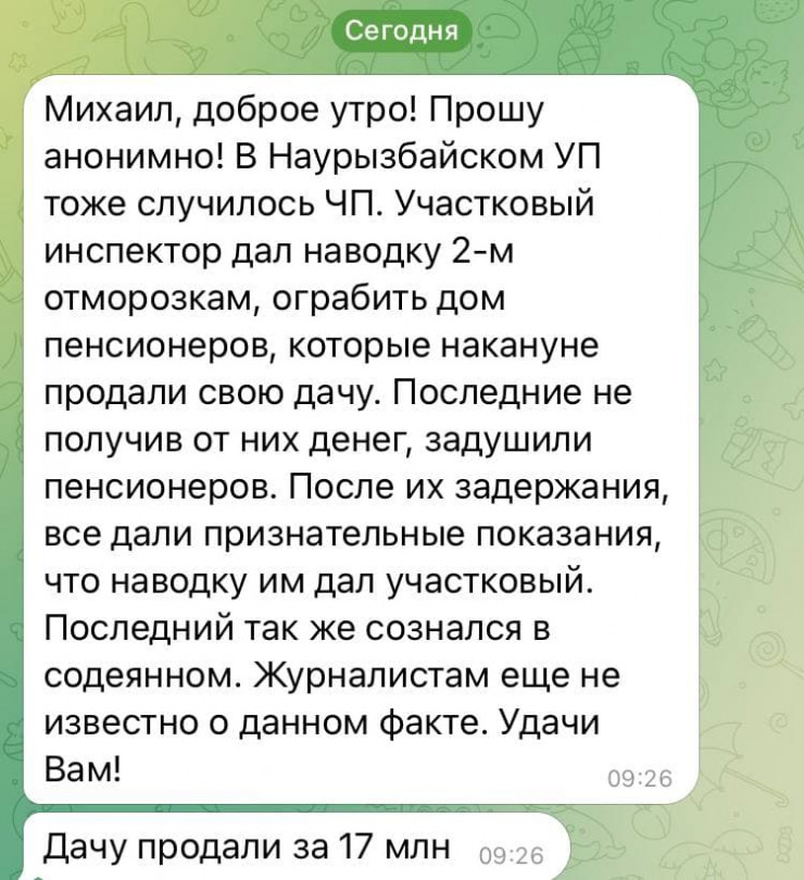 "Прошу анонимно. В Наурызбайском УП тоже случилось ЧП. Участковый инспектор дал наводку двум отморозкам ограбить дом пенсионеров, которые накануне продали дачу. Последние, не получив от них денег, задушили пенсионеров. После их задержания все дали признательные показания, что наводку им дал участковый. Последний также сознался в содеянном", - говорится в сообщении от анонимного автора.