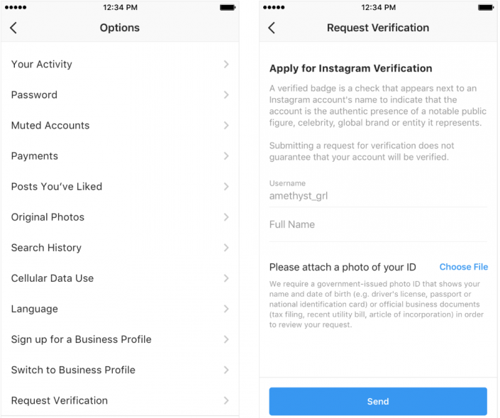 Чтобы подать заявку на "получение синей галочки" стоит зайти в меню "Настройки" и выбрать пункт "Запрос на подтверждение". После этого вам предложат указать имя пользователя, которое написано в профиле, ваше настоящее имя и прикрепить копию паспорта или иного документа, подтверждающего вашу личность.