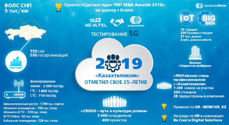 Сообщается, что в 2018 году "Казахтелеком" заключил сделку о покупке 75 процентов акций АО "Кселл". Данные приобретения позволили компании выстраивать интегрированную телекоммуникационную площадку, охватывающую весь Казахстан. Необходимо также отметить, что за сделку по приобретению акций АО "Кселл" компании присудили престижную премию TMT M&A Awards 2019. Награду вручили члену совета директоров АО "Казахтелеком" Ерулану Кусаинову в Лондоне.