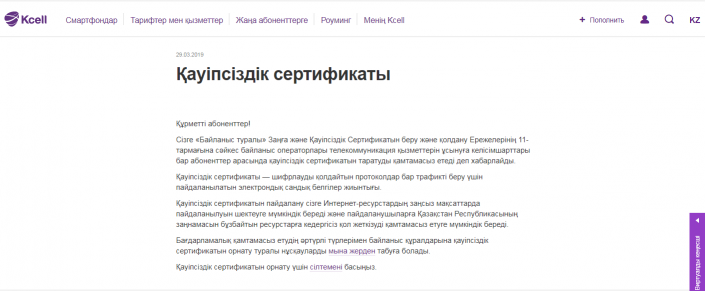 Тіпті Kcell және Activ байланыс операторларының ресми сайтында қауіпсіздік сертификатын орнату туралы ескертулер жарияланған.
