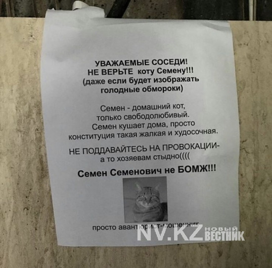 В социальных сетях опубликовали забавное фото, заснятое в одном из карагандинских подъездов. Хозяева "свободолюбивого" кота Семена с юмором рассказали соседям о его повадках. Карагандинцы просят соседей не верить их домашнему авантюристу, который прекрасно питается дома, но не упускает возможности клянчить еду у сердобольных соседей.