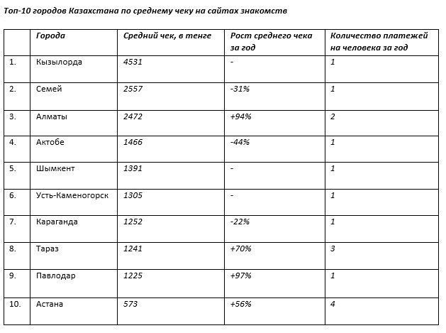 В среднем платеж на сайтах знакомств за год в Казахстане вырос почти на треть до 2 049 тенге. При этом сильнее всего средние чеки выросли у жителей Алматы и Павлодара - почти в два раза. А самые экономные - пользователи из Актобе и Шымкента: за год они израсходовали на знакомства в интернете меньше всех. Также сообщается, что в среднем казахстанцы совершают по три платежа в год. Больше всего денег пользователи израсходовали на сервисах Mamba, LovePlanet, Teamo, "Галактика знакомств" и Kisses. Люди оплачивают VIP-статусы, попадание в топ, продвижение анкет, комплименты и режим "Невидимка".