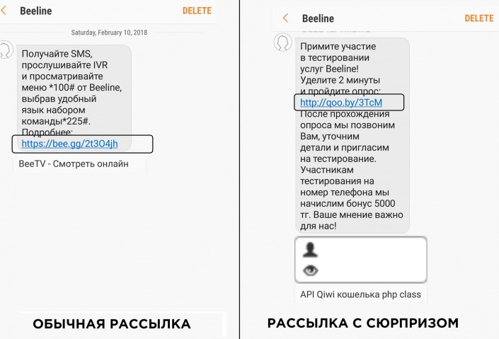 "Полчаса назад на мой телефонный номер пришла рассылка от абонента без номера, но с названием Beeline. Казалось бы, обычная спам рассылка от дорогого оператора, но один момент заставил меня заинтересоваться текстом и ознакомиться с ним более внимательно. (...) В тексте был использован странный укротитель ссылок, который ранее я не встречал в рассылках от оператора", - пишет пользователь Nurzhan Adilovich в Facebook. (орфография и пунктуация автора в основном сохранены)