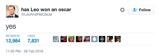 Также появился специальный аккаунт под названием "Выиграл ли "Оскар" Лео". Последняя запись, собравшая большое количество лайков и ретвитов, состоит из одного слова - "Да".