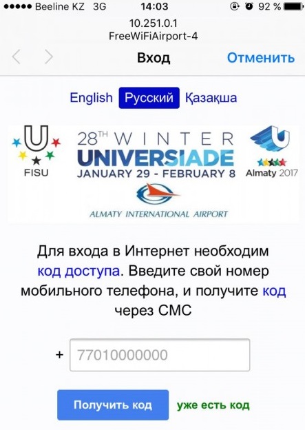 Во Дворце спорта и культуры имени Балуана Шолака, где сейчас проходят игры зимней Универсиады, есть доступ к бесплатному Wi-Fi столовой Madeni, которая расположена в этом же здании. Для входа в Сеть необходимо сперва поставить галочку, что вам есть 18 лет, затем вбить номер мобильного телефона и дождаться код доступа. После этого полученный пароль нужно ввести в следующее окошко и нажать "Дальше". Только после этой процедуры можно будет выйти в Интернет.