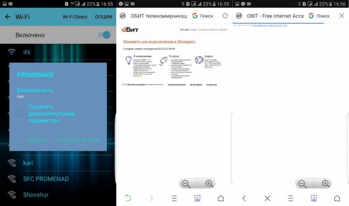 В торговом центре Promenade подключение к бесплатному Wi-Fi происходит следующим образом: в доступных сетях нужно выбрать "PROMENADE" и нажать кнопку "Подключиться". Затем зайти в браузер, который выведет на сайт авторизации. Там необходимо выбрать "Нажмите для подключения к Интернету". Только после этой процедуры устройство выйдет во всемирную паутину. Такой формы авторизации в правилах нет.