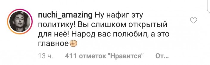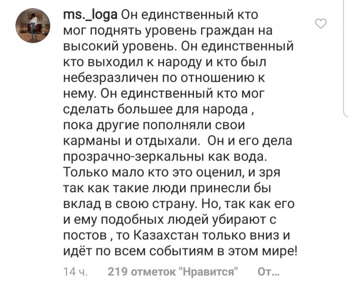 "Он единственный, кто мог поднять уровень граждан на высокий уровень. Он единственный, кто выходил к народу и кто был небезразличен по отношению к нему. Он единственный, кто мог сделать большее для народа, пока другие пополняли свои карманы и отдыхали. Он и его дела прозрачно-зеркальны как вода. Только мало кто это оценил, и зря, так как такие люди принесли бы вклад в свою страну," - пишет @ms._loga.