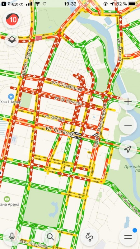 Сервис Яндекс.Карты отображает 10-балльную загруженность на центральных дорогах столицы. Заторы образовались на проспекте Республики, улицах Кенесары, Валиханова, Иманова, Бараева, Кунаева, на проспектах Абая, Богенбай батыра и Туран, улице Акмешит.