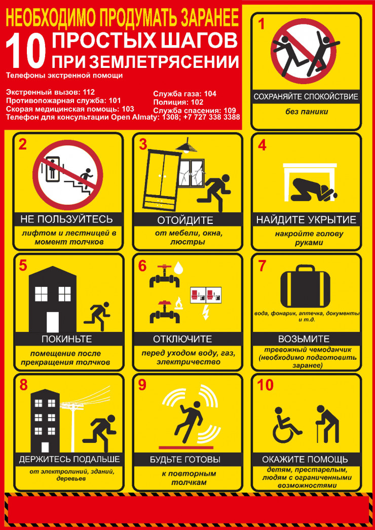 Поэтому каждый житель Алматы должен знать "10 простых шагов при землетрясении". Вы можете сохранить эти рекомендации в своем телефоне и поделиться ими в социальных сетях.