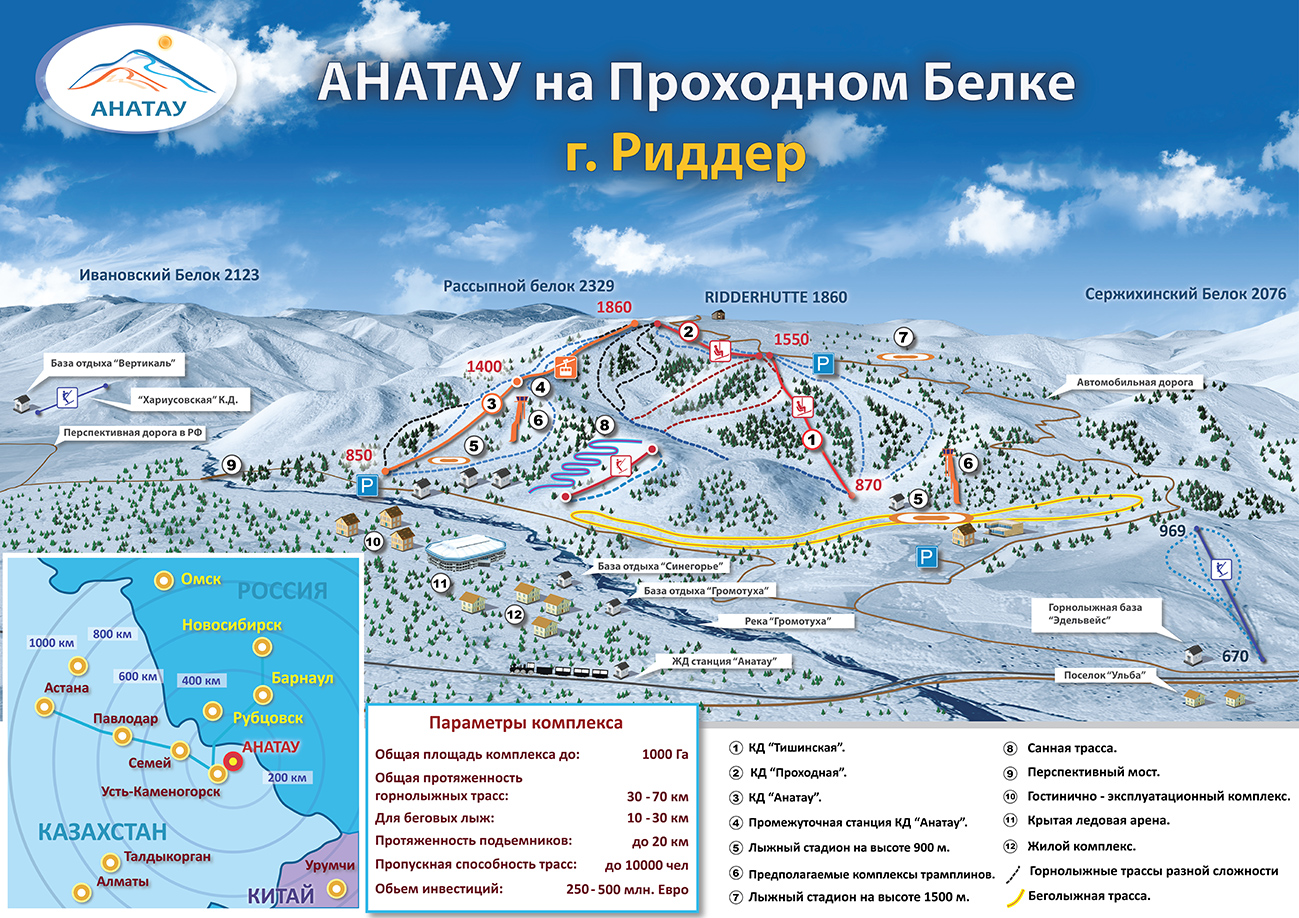 Лыжный комплекс "Анатау" планируют построить в Алтайских горах. По словам собеседника, склоны горнолыжного курорта смогут легко разместить трассы разной сложности с суммарной протяженностью до 100 километров. "От вершины "Анатау" (1860 метров над уровнем моря. - Прим. автора) почти по всем радиальным направлениям возможна установка канатных дорог, кабинных, бугельных и кресельных с перепадом до тысячи метров по высоте и протяженностью до пяти километров. В западном направлении от вершины, на высоте 1500 метров, можно расположить биатлонно-лыжный стадион с развитой инфраструктурой. Инфраструктуру комплекса намечается разместить у подножия северо-западного и северного склонов, а также на верхних участках в западном направлении от вершины на высоте 1300-1500 метров", - рассказал Швагерус.