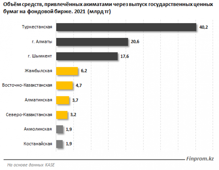 На казахстанской бирже KASE свои облигации выпустили 9 акиматов областей и городов республиканского значения. При этом от общей суммы займов в 100 миллиардов тенге 40,2 миллиарда привлекла только Туркестанская область. Акимат области размещал облигации в марте и июне, для того чтобы покрыть расходы по программе "Дорожная карта занятости на 2020–2021 годы", а также другие государственные и правительственные программы.