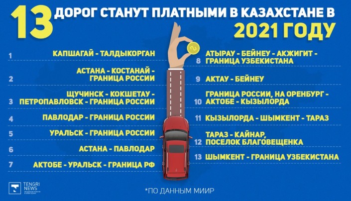 13 дорог станут платными в Казахстане в 2021 году