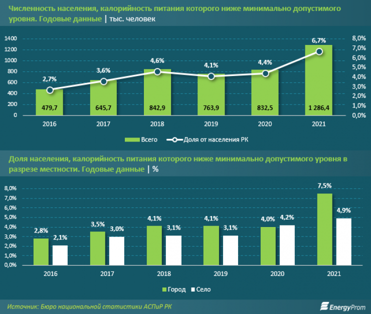 Минимальная суточная норма питания в Казахстане составляет 1861 килокалорию. В 2021 году 6,1 процента населения питались ниже минимального уровня. Это более чем на два процента выше, чем за год до этого. Численность недоедающих в стране за год выросла более чем в полтора раза: с 832,5 тысячи человек в 2020-м до 1,3 миллиона человек в 2021 году.