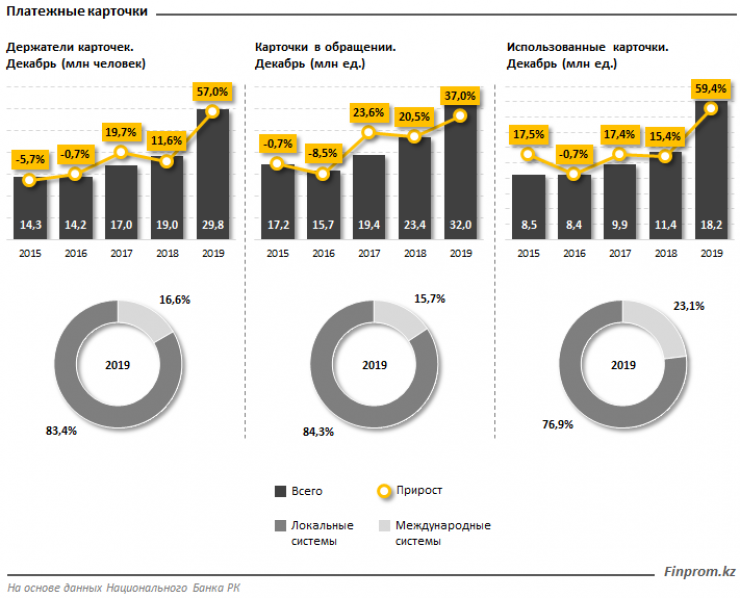 На конец 2019 года в Казахстане насчитывалось 29,8 миллиона держателей карточек - на 57 процентов больше, чем годом ранее. Всего же в обращении было 32 миллиона платежных карточек - на 37 процентов больше, чем на конец декабря 2018 года. Из них активно использовались 18,2 миллиона карточек - на 59,4 процента больше, чем в прошлом году.