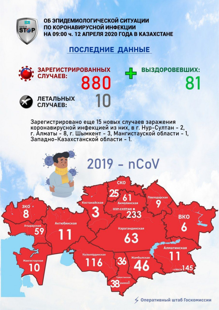 Из 15 новых случаев: в Нур-Султане - 2,  Алматы - 8, Мангистауской области - 1, Шымкенте - 3, Западно-Казахстанской области - 1.