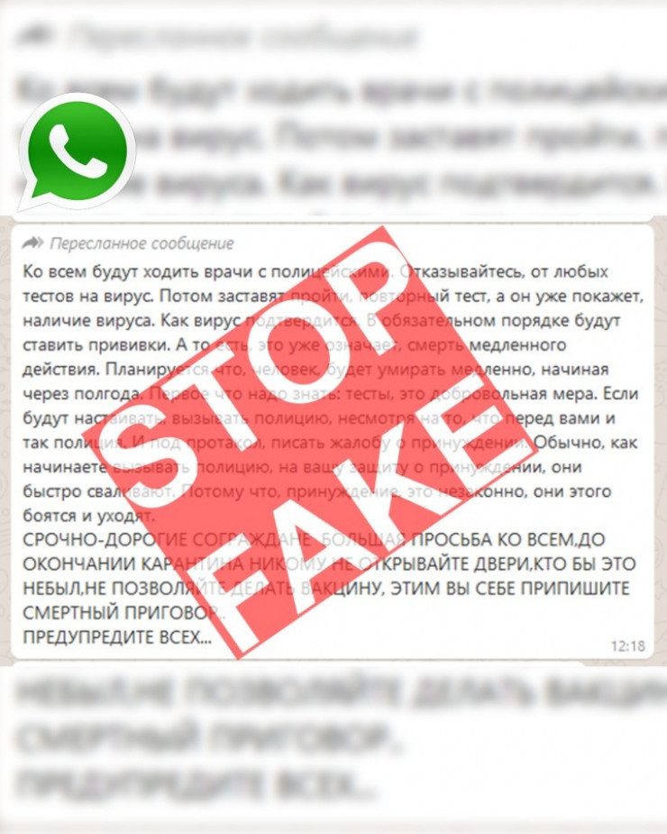 Сондай хабарламалардың бірінде белгісіз автор 13 сөйлемнен тұратын мәтінінде пәтердің есігін ешкімге, әсіресе полиция қызметкерлерімен бірге келген дәрігерлерге ашпауға шақырады.