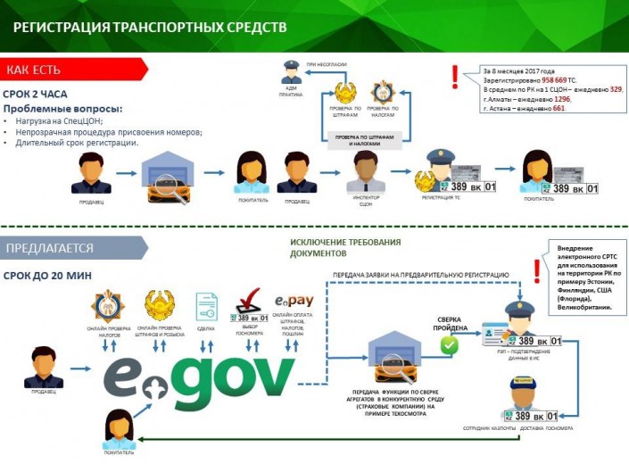 "А теперь подача заявки на регистрацию автомобиля будет онлайн. Сначала вы подаете заявку на портале электронного правительства, где сразу проходите проверку на неоплаченные штрафы, налоги, выбираете госномер, далее продавец подтверждает сделку и вы отправляетесь на сверку кузова в любой пункт техосмотра или ангар в спецЦОНе (при этом уже идет процесс изготовления нового техпаспорта). После прохождения сверки транспорта сотрудник полиции завершает регистрацию и вы можете получить уже готовые номер и техпаспорт в спецЦОНе или заказать их доставку по удобному адресу через АО "Казпочта". Таким образом, планируется сократить время на регистрацию автотранспорта с двух часов до 20 минут", - рассказал Оспанов.