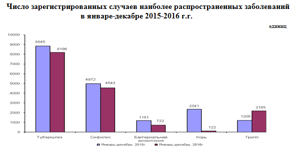 Также в 2016 году зарегистрировано 19 случаев заболевания сибирской язвой. Наибольшее распространение среди зарегистрированных инфекционных заболеваний на 100 000 населения получили острые инфекции верхних дыхательных путей - 4368,3 (в соответствующем периоде 2015 года - 4036,5), острые кишечные инфекции - 68,7 (74,8), туберкулез органов дыхания - 46,4 (50,4), сифилис - 25,7 (28,4), вирусные гепатиты - 3,1 (3,3).