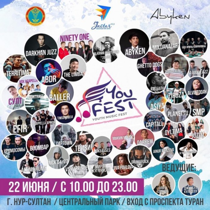 В Центральном парке столицы пройдет масштабный музыкальный фестиваль YouFest, который соберет самых популярных молодых отечественных исполнителей. С утра до позднего вечера в парке со стороны проспекта Туран жителей и гостей города приглашают потанцевать под любимые хиты современности.